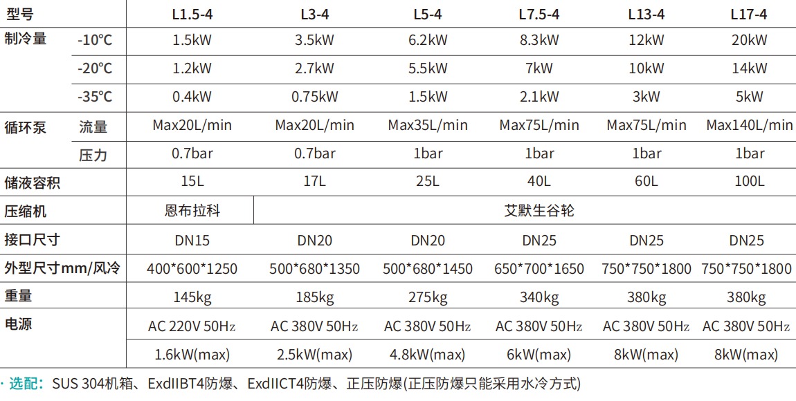 型號制冷量循環(huán)泵儲液容積壓縮機接口尺寸外型尺寸mm/風(fēng)冷重量電源